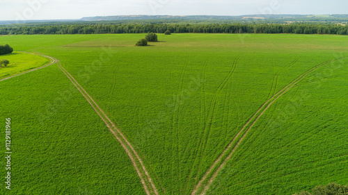© AeroDrone, Obraz premium Field of green grass with a dirt road running through it
