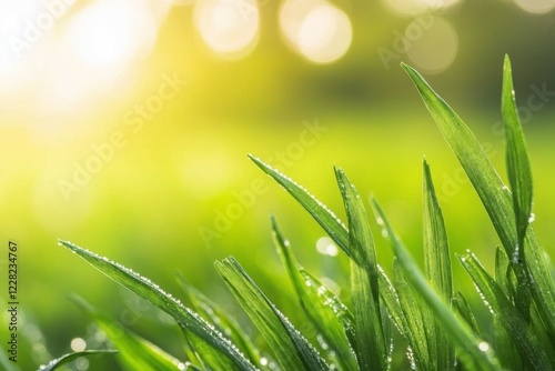 © Space Priest, Fototapeta premium Field of green grass with dew on the blades