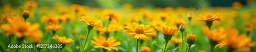 © Anulak, Fototapeta premium Field of orange calendula flowers amidst summer foliage, greens, summer