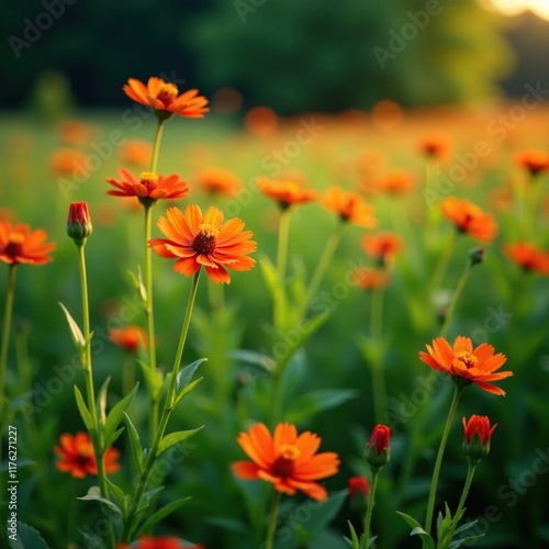 © Withun, Obraz premium Field of orange hawkweed flowers swaying gently, evening, hawkweed