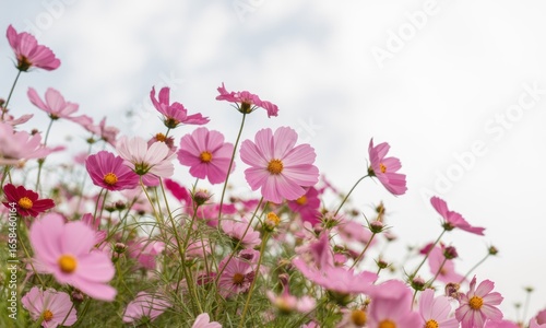 Fototapeta premium Field of pink cosmos flowers reaching toward a bright, cloudy sky