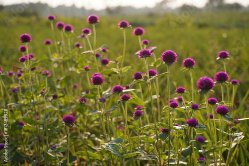 © DEBU, Naklejka premium Field of pink globe amaranth flowers blooming in green meadow at sunrise