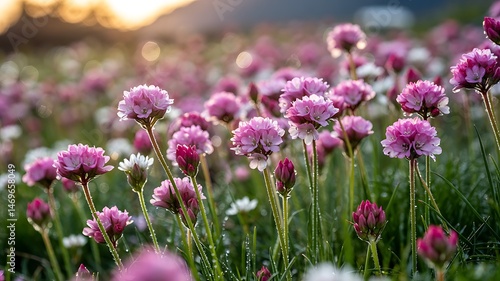 © BEST , Fototapeta premium Field Of Pink Sea Thrift Flowers Blooming At Sunset With Soft Golden Light