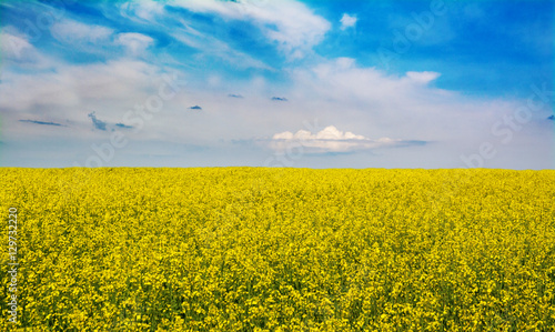 © fotohunt, Fototapeta premium Field of rapeseed against sky with clouds