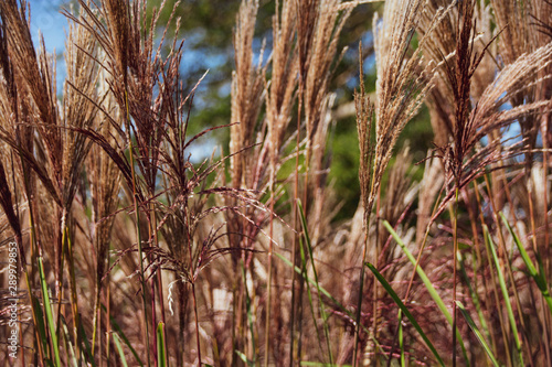 Fototapeta premium Field of red, brown and green grass growing in Somerset