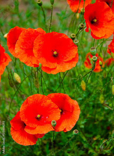 © andrey7777777, Obraz premium field of red poppies at sunset.flower closeup nature colorful grass