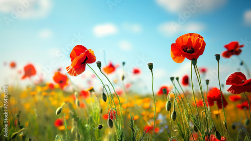 Obraz premium field of red poppies summer blue sky and clouds