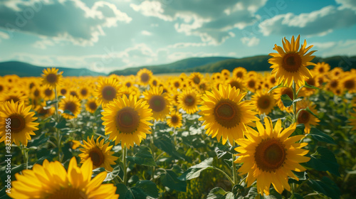 Fototapeta premium Field of ripe sunflowers on a sunset field. On a sunny day, sunflowers on an...