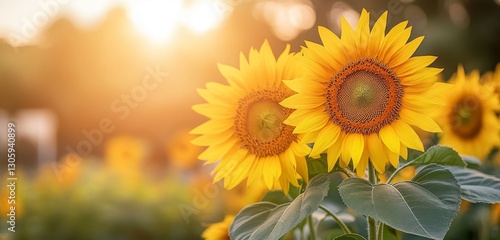 Obraz premium Field of sunflowers facing the golden sunset