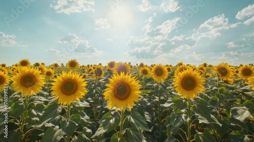 Fototapeta premium Field of sunflowers with solar trackers mimicking flower movements, time-lapse effect