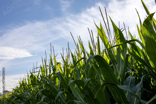 © Evgeniia, Fototapeta premium Field of tall corn plants against blue sky on sunny day. Agricultural landscape with maize crops growing in summer season