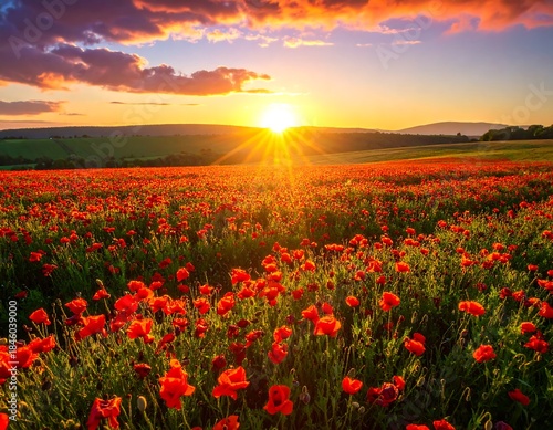 Fototapeta premium Field of vibrant red flowers under a golden sunset glow