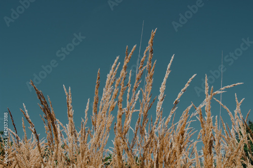 Fototapeta premium Field of wheat on a sunny day with clear blue skies