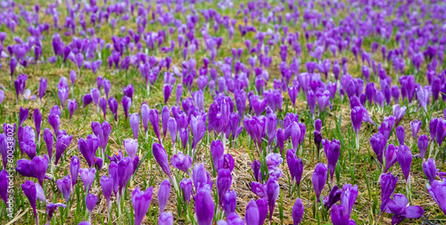 © sebi_2569, Naklejka premium Field of wild purple crocuses with selective focus