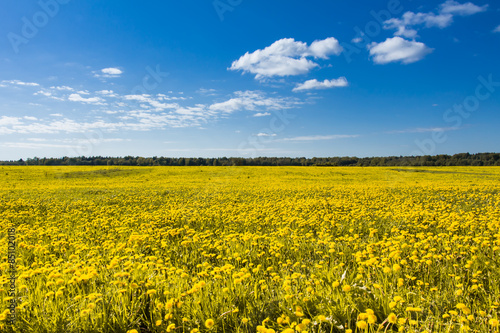 © lizavetta, Obraz premium Field of yellow dandelions against the blue sky.
