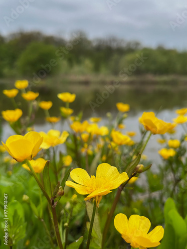 © Anastasia Knyazeva, Obraz premium Field of yellow flowers by a lake
