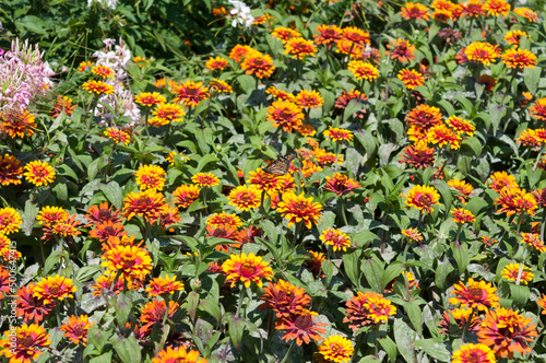 © eugen, Naklejka premium field of zinnia flowers and butterfly