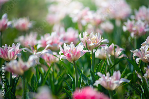 Fototapeta premium Field pink flower tulip close up on a blurred background