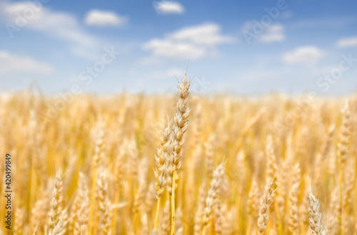 © Anastasiia Malinich, Fototapeta premium Field wheat in period harvest on background cloudy sky