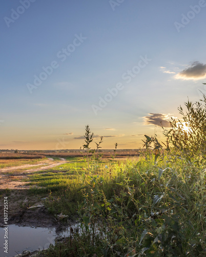 © Sergei, Obraz premium Field with a dirt road and a stream