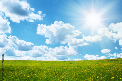 © candy1812, Obraz premium Field with dandelions and blue sky