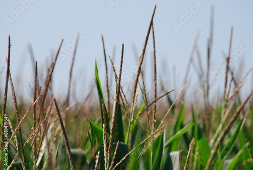 © Andrew_Swarga, Fototapeta premium Field with growing corn. Tall corn grows in the field, the plant has long, tall, thick stems and wide, long green leaves. Corn has brown seeds on thin stalks on top. Plants grow close to each other.