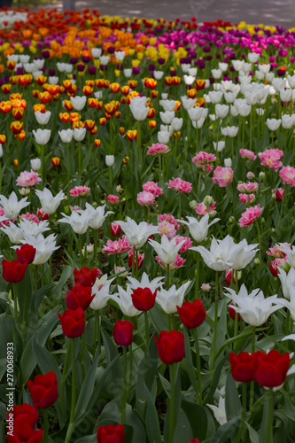 © Elen Spirit, Fototapeta premium field with large bright multicolored tulips lit by the sun.