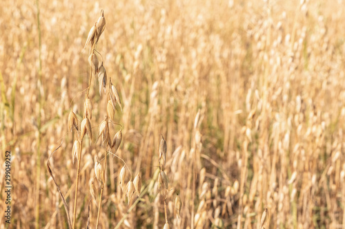 Fototapeta premium Field with oats. Background of Golden oats close up.
