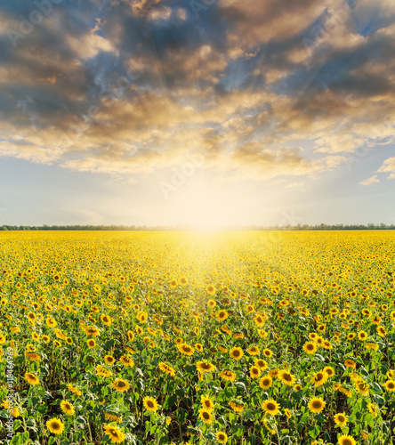 Fototapeta premium field with sunflower and sunset in dramatic sky