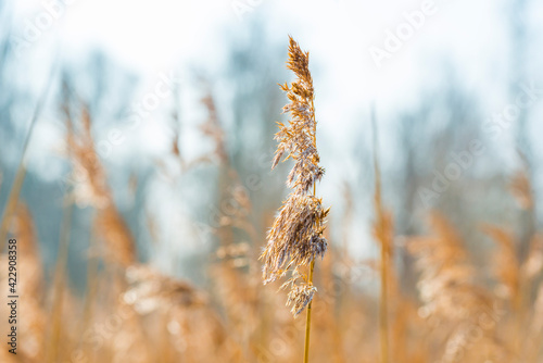 Fototapeta premium Field with trees, reed and bushes in wetland in bright sunlight in spring,...