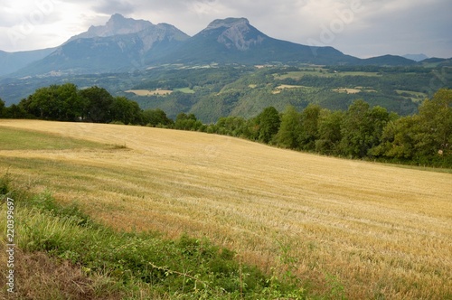 © Aliaksandr, Fototapeta premium field with wheat in the france alps mountains
