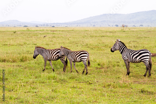 Fototapeta premium Field with zebras and blue wildebeest