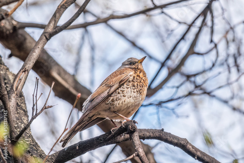 Fototapeta premium Fieldbird sits on a branch in spring with a blurred background.