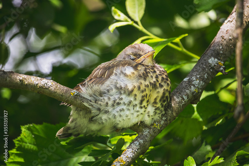 © Roman, Obraz premium Fieldfare - one young small bird on a branch of the tree - sleeping