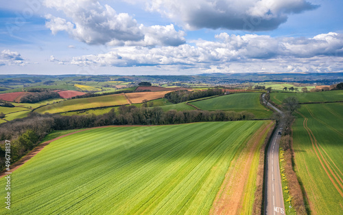 © Maciej Olszewski, Fototapeta premium Fields and Meadows over English Village, Berry Pomeroy, Devon, England, Europe