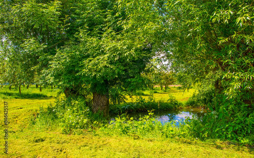 Obraz premium Fields and trees in a green hilly grassy landscape under a blue sky in...