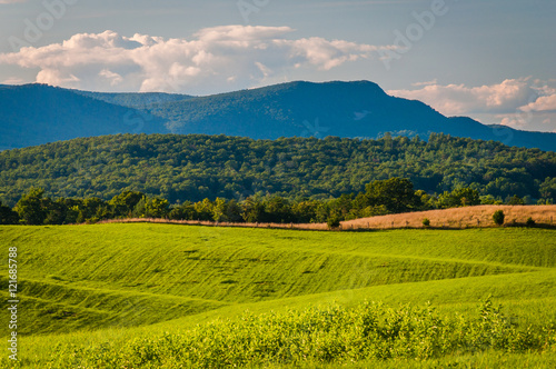 Fototapeta premium Fields and view of distant mountains in the rural Shenandoah Val