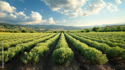 Fototapeta premium Fields bordered by small shrubs, blue sky