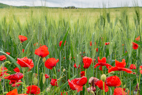 © barmalini, Fototapeta premium Fields with unripe green pasta durum wheat and red poppies on Sicily, Italy