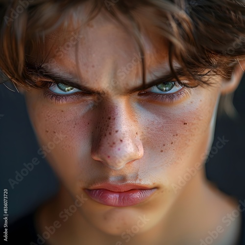 © Thares2020, Fototapeta premium Fierce and Defiant Teenage Boy Face with Intense Expression
