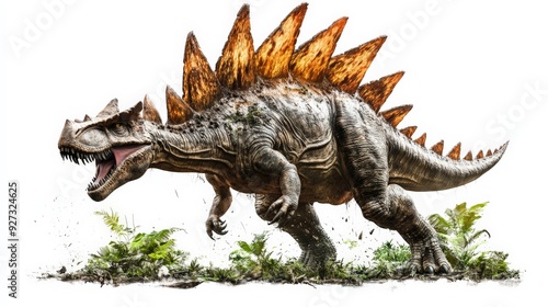 © arhendrix, Naklejka premium Fierce dinosaur with spiked back in a dynamic, roaring pose, surrounded by greenery, showcasing prehistoric wildlife in vivid detail.