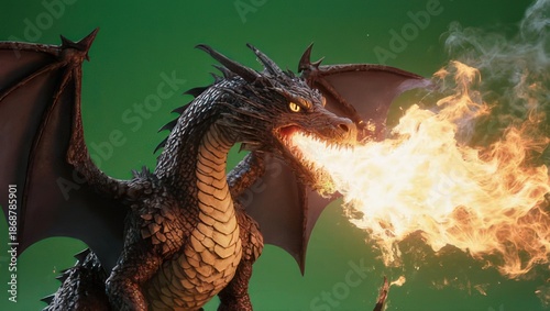 © Musthofa, Fototapeta premium Fierce Dragon Breathing Fire with Wings Spread Wide.