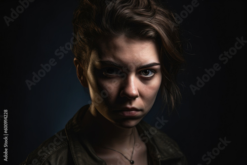 Fototapeta premium Fierce female portrait with an angry expression captured in a studio setting with dramatic lighting and deep shadows, generative ai