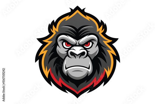 © Sonda, Fototapeta premium Fierce gray gorilla head shows intense red eyes and determined expression