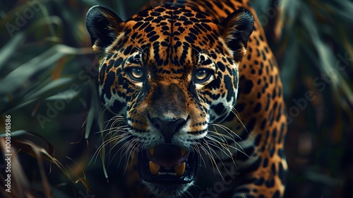 © Thares2020, Obraz premium Fierce Jaguar Predator with Glowing Eyes and Snarling Expression Captured in Close up Portrait
