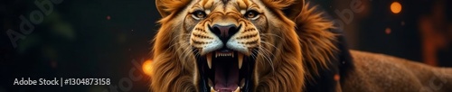 © Pawarit, Obraz premium Fierce lion's face with open jaws and sharp teeth , predators, wild