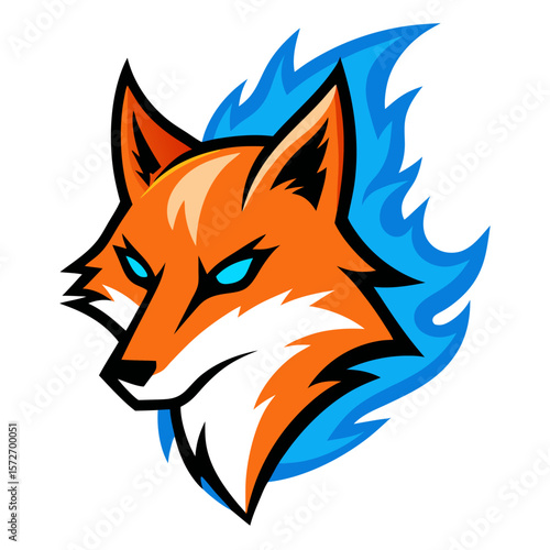 © Nobel Fahad, Obraz premium Fierce Orange Fox Head with Electric Blue Flame Outline in Bold Cartoon Vector Style