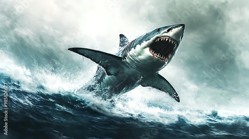 © Keattipoom, Fototapeta premium Fierce Shark Leaping Out of Stormy Ocean - Dramatic Illustration on White Background in High Resolution