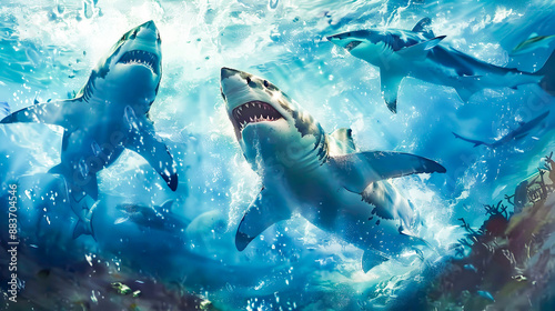 © Like Animals, Fototapeta premium Fierce shark predators aggressively chasing and attacking a seal prey in a dramatic chaotic underwater scene filled with crashing waves bubbles and the powerful movements of the marine animals