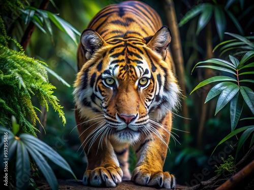 Fototapeta premium Fierce tiger's intense gaze fixes on prey, muscles coiled and claws extended,...